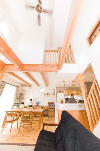 一歩、中へ踏み入れれば、天から降り注ぐ光のシャワーがあなたを迎えます。圧倒的な開放感を生む「吹き抜け」は、単なる空間の広がりではありません。それは、家族の気配が家全体をめぐる、優しい空気の通り道。2階で本を読む子どもの気配、キッチンで鼻歌を歌う妻の楽しげな音色。どこにいても、見えなくても、家族という「ひとつの生命体」の温かい鼓動を感じられるのです。