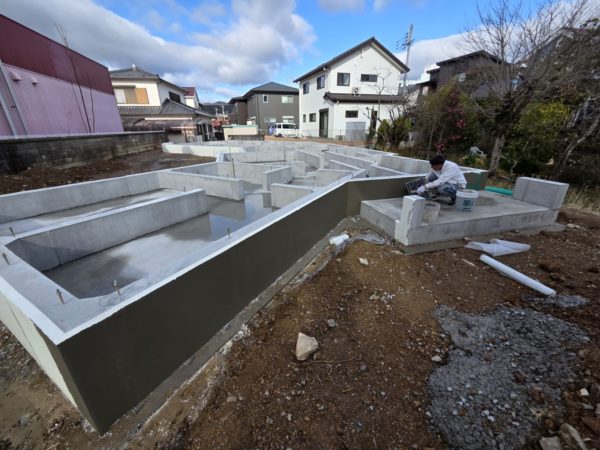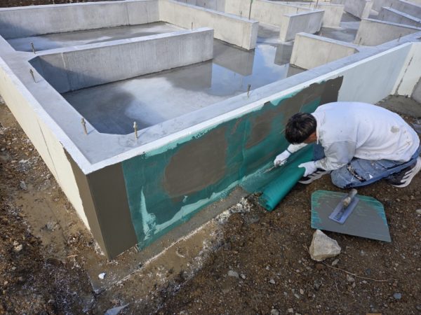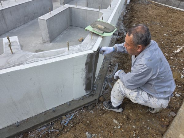 養生期間が終わり型枠を解体し、本日左官屋さんに基礎外張り断熱の表面を樹脂モルタルにて