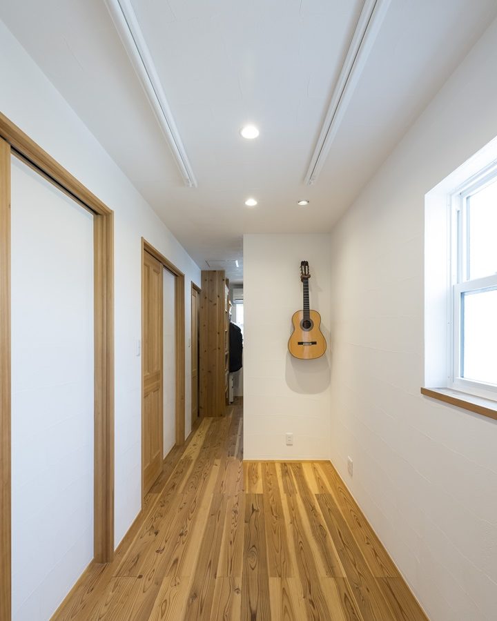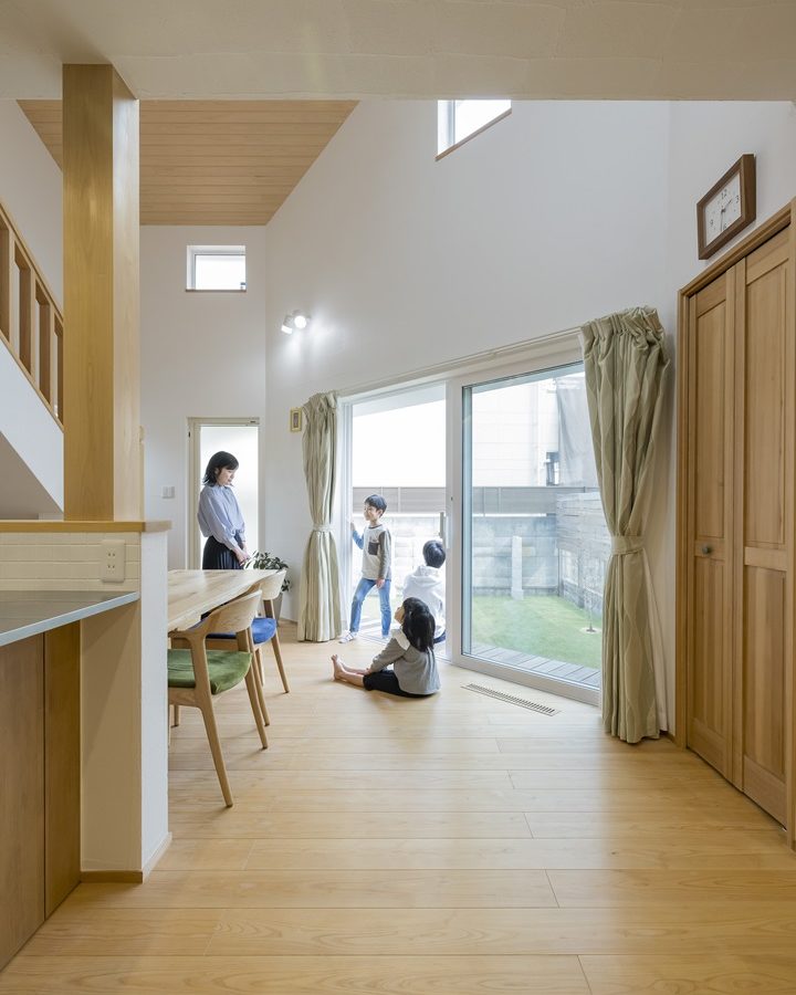 漆喰の壁が柔らかな光を受けとめ、無垢の木が家族を包み込みます。