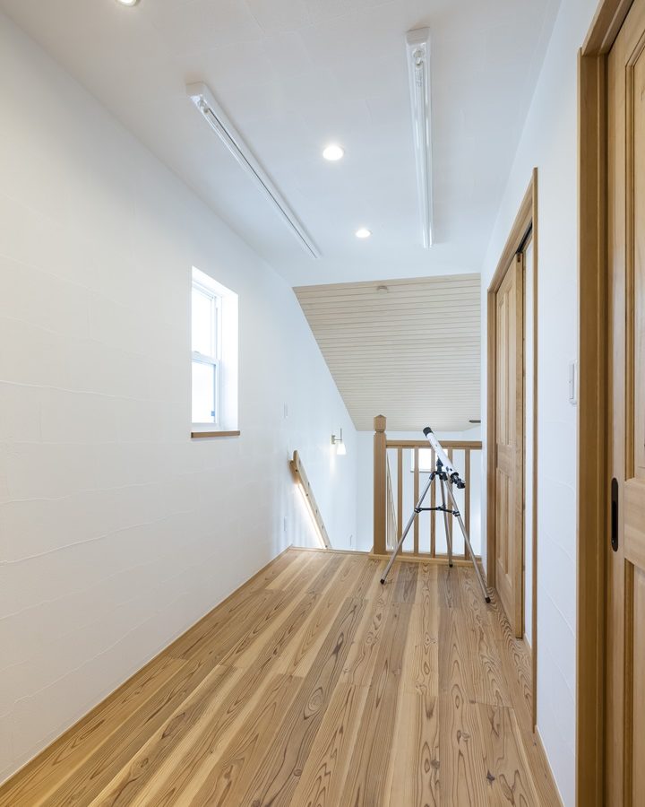 上下階を繋がりを深めてくれる吹き抜けを板張り天井で美しく仕上げ、 間接光が美しい造作で作った手摺のあるオープン階段は開放的な空間を演出し、一体感を醸し出してくれます。