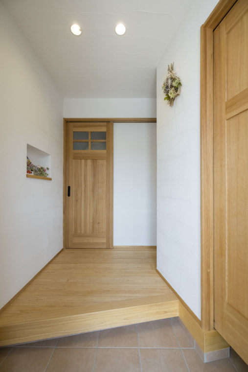 静かな白に抱かれ、木の香りにそっと迎えられる玄関。
